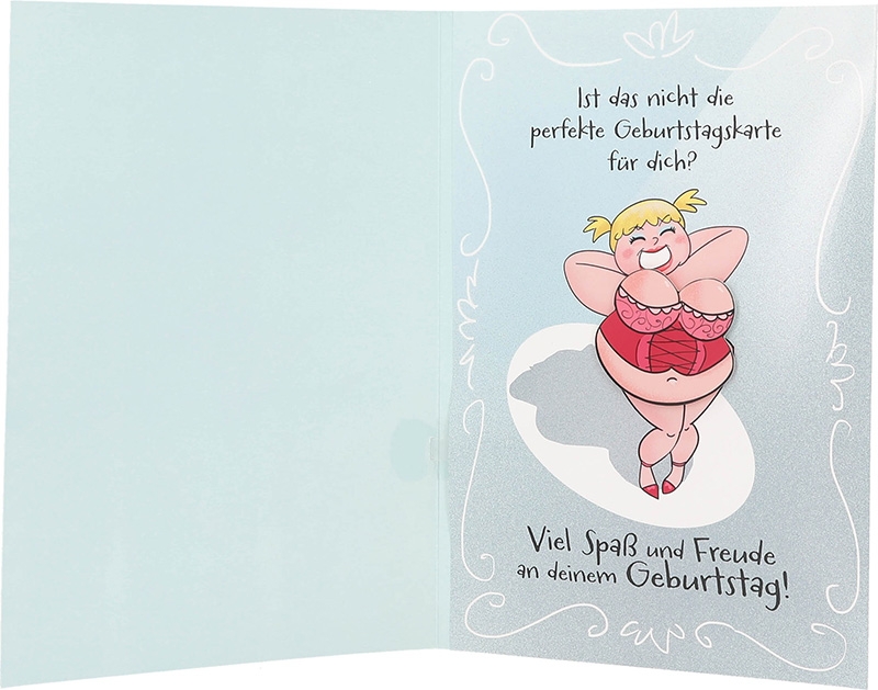 Beim Aufklappen der Karte folgt die musikalische Überraschung: Eine ganze Dame tanzt in Dessous, voller Energie und Charme. Die Szene erwacht zum Leben, sobald die Karte geöffnet wird. Die Botschaft vollendet den Gedanken der Vorderseite: “Ist das nicht die perfekte Geburtstagskarte für dich?” “Viel Spaß und Freude an deinem Geburtstag” – eine liebevolle Erinnerung daran, dass Lebensfreude keine Zahl kennt.