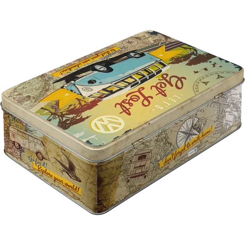 Die flache Vorratsdose besticht durch ihr detailreiches “Let’s Get Lost”-Motiv. Dieses zeigt einen klassischen, hellblauen VW Bulli (T1) vor einer stilisierten Weltkarte und einer abenteuerlichen Landschaft. Das Design fängt den Geist von Roadtrips und ungebundenen Reisen perfekt ein.