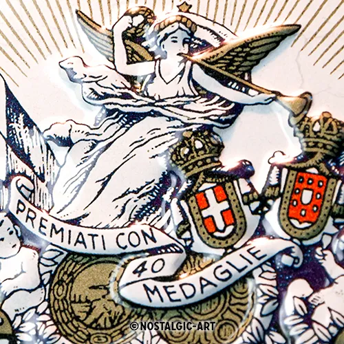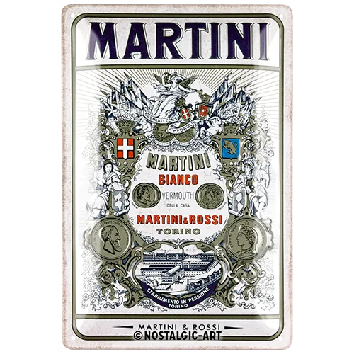 Dieses Schild fängt die Eleganz der Marke Martini perfekt ein. Das Motiv basiert auf historischen Werbeplakaten und alten Bianco-Flaschenetiketten, die heute als Ikonen der Designgeschichte gelten. Mit der detailreichen Darstellung klassischer Wappen, Medaillen und der markanten Typografie strahlt das Schild einen authentischen Vintage-Charme aus. Es ist ein offiziell lizenziertes Martini-Produkt, was Sammlern und Liebhabern die Treue zum Original garantiert.