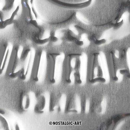Ein besonderes Highlight ist die mehrstufige Motivprägung. Durch dieses Verfahren werden bestimmte Elemente des Designs hervorgehoben, wodurch eine beeindruckende 3D-Optik entsteht. Das Licht bricht sich auf den geprägten Flächen und verleiht dem Schild eine Tiefe, die es an jeder Wand zum absoluten Blickfang macht. Die leichte Wölbung sorgt für zusätzliche Stabilität und unterstreicht den plastischen Charakter.