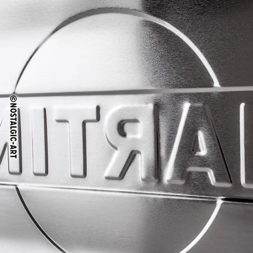 Ein besonderes haptisches Erlebnis bietet die aufwendige Motivprägung auf mehreren Ebenen. Das Logo und die Schriftzüge sind nicht einfach nur aufgedruckt, sondern plastisch herausgearbeitet. Diese dreidimensionale Darstellung verleiht dem Design eine beeindruckende Tiefe und Wertigkeit. Die leichte Wölbung des Blechs sorgt zudem für eine klassische Emaille-Schild-Anmutung und zusätzliche Stabilität.