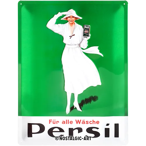 Persil gehört zu jenen großen deutschen Traditionsmarken, die weltweit für Zuverlässigkeit stehen. Die „Weiße Dame“ im eleganten weißen Kleid ist seit Jahrzehnten das Symbol für Reinheit und erstklassige Pflege. In dieser exklusiven Kollektion wird die Geschichte von Marken wie Persil auf hochwertigem Blech festgehalten und für moderne Wohnkonzepte neu interpretiert. Als offiziell lizenziertes Traditionsmarken-Produkt ist dieses Schild ein authentisches Sammlerstück für Liebhaber klassischer Designs.