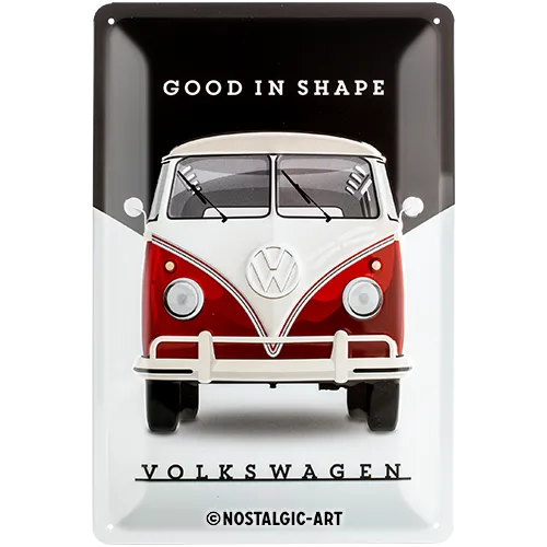 Ob im Wohnzimmer, in der Garage, im Partykeller oder in der Werkstatt – dieses Blechschild verleiht jedem Raum eine authentische Vintage-Atmosphäre. Das Motiv zeigt die markante Front des klassischen VW-Busses, ergänzt durch den passenden Slogan „Good in Shape“. Es ist das ideale Accessoire für Oldtimer-Liebhaber, Weltenbummler und Fans von klassischem Design. Als offiziell lizenziertes Volkswagen-Produkt garantiert es zudem absolute Detailtreue und Markenauthentizität.