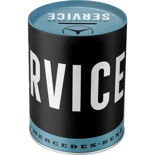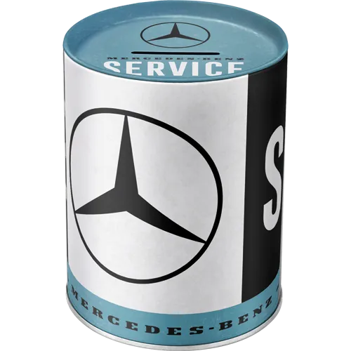 Schon auf den ersten Blick wirkt die Spardose edel und charakterstark. Das Design in Schwarz, Weiß und Blau erinnert an klassische Werkstatt-Schilder sowie an historische Service-Motive der Marke. Gleichzeitig zeigt das Motiv das bekannte Mercedes-Benz Logo sowie den markanten Schriftzug „Service“. Dadurch entsteht eine authentische Optik, die an traditionsreiche Werkstätten, legendäre Fahrzeuge und an die lange Geschichte der Marke erinnert. Und genau deshalb begeistert diese Spardose sowohl Sammler als auch Automobilfans.