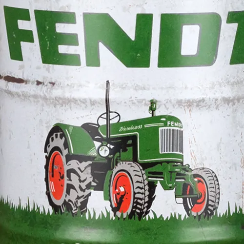 Das Design selbst unterstreicht diese Atmosphäre perfekt. Die Kombination aus Weiß und Grün wirkt frisch, klar und zugleich traditionell. Gleichzeitig zeigt das Motiv das bekannte Fendt-Logo sowie einen klassischen Traktor auf einer grünen Wiese. Dadurch entsteht eine Szene, die Ruhe, Kraft und Naturverbundenheit ausstrahlt. Darüber hinaus sorgen gezielte Vintage-Effekte wie abblätternder Lack und dezente Ölspuren für eine besonders authentische Optik. Und genau deshalb wirkt die Spardose Ölfass Fendt wie ein echtes Stück Landwirtschaftsgeschichte.
