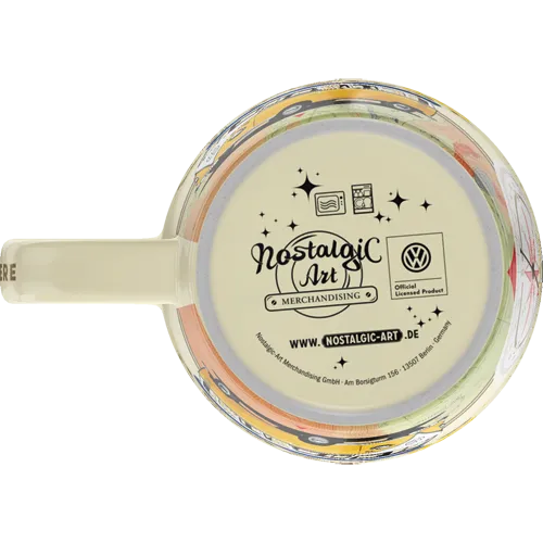 Doch es ist nicht nur die Qualität, die begeistert. Es ist vor allem das Design. In warmem Gelb und Weiß gehalten, zeigt die Tasse VW Bulli zahlreiche Reisemotive: den ikonischen Bulli mit Kanu auf dem Dach, eine Landkarte, einen Kompass und liebevolle Schriftzüge. Sogar der Henkel ist dekoriert – und das verleiht ihr einen einzigartigen Charme. So entsteht ein Gesamtbild, das zum Träumen einlädt, aber auch Erinnerungen weckt.