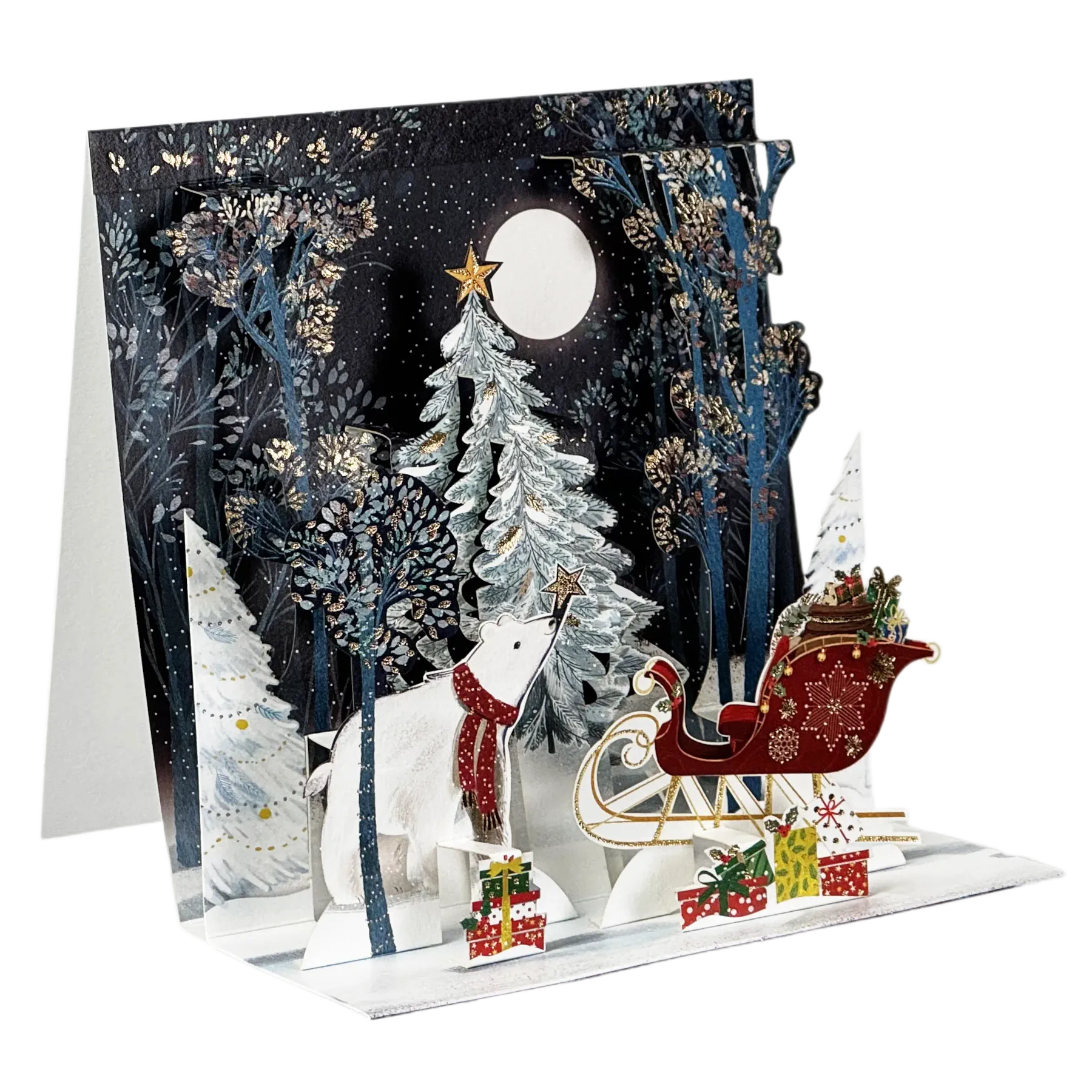 Künstlerische Pop-up-Karte „Winterwald mit Schlitten“ – Einzigartiges Miniaturkunstwerk zu Weihnachten