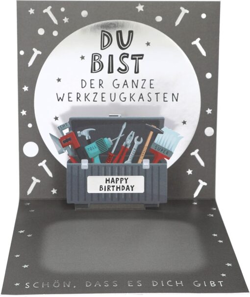 Wenn ein Mensch alles reparieren kann, dann verdient man sich einen ganz besonderen Glückwunsch. Die Pop-up-Musikkarte „Du bist nicht nur der Hammer – du bist der ganze Werkzeugkasten“ ist viel mehr als nur eine Karte – sie ist ein Zeichen der Bewunderung.