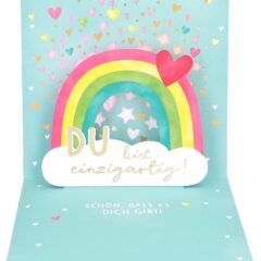 Der der wahre Zauber entfaltet sich beim Öffnen. Der schöne Song: “A sky full of Stars” erklingt – Herzen und Sterne leuchten, ein wunderschöner Lichteffekt.. Dazu ein Regenbogen mit dem Schriftzug “Du bist einzigartig!”