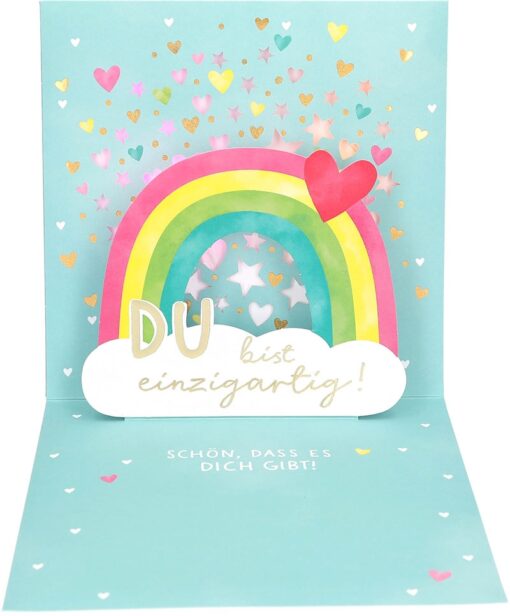 Der der wahre Zauber entfaltet sich beim Öffnen. Der schöne Song: “A sky full of Stars” erklingt – Herzen und Sterne leuchten, ein wunderschöner Lichteffekt.. Dazu ein Regenbogen mit dem Schriftzug “Du bist einzigartig!”