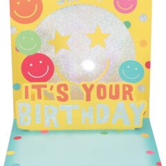 Beim Aufklappen wird es noch besser. Der Partyklassiker „Happy“ beginnt zu spielen. Gleichzeitig erhebt sich ein lustiges Pop-up-Element mit Smilys. Dazu leuchtet ein fröhlicher Lichteffekt, der die Szene perfekt abrundet. Im Inneren steht zusätzlich ein schlichtes, herzliches: „IIt’s your Birthday – herzlichen Glückwunsch“.
