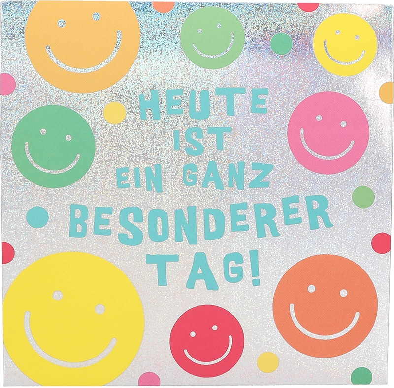 Schon das Cover bringt ein Lächeln aufs Gesicht: Ein silberner Hintergrund mit gelben, grünen, orangen und pinken Smilys. In der Mitte steht der Schriftzug: „Heute ist ein ganz besonderer Tag“.