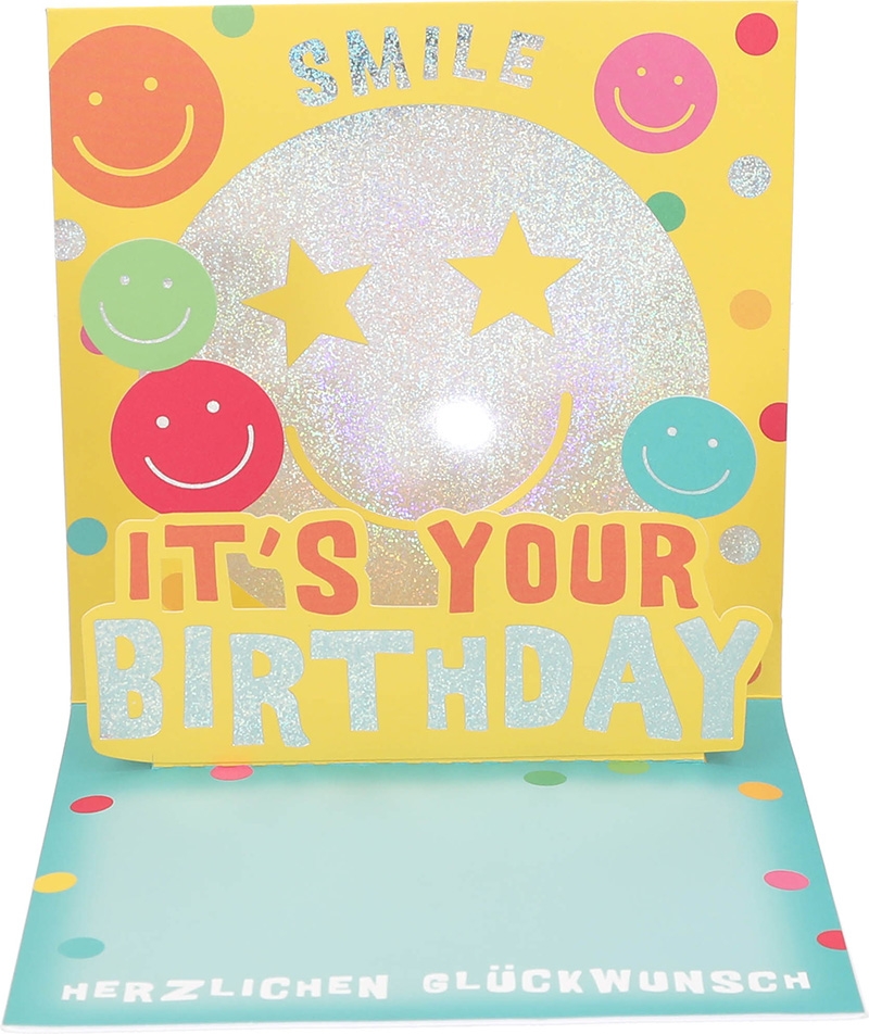 Beim Aufklappen wird es noch besser. Der Partyklassiker „Happy“ beginnt zu spielen. Gleichzeitig erhebt sich ein lustiges Pop-up-Element mit Smilys. Dazu leuchtet ein fröhlicher Lichteffekt, der die Szene perfekt abrundet. Im Inneren steht zusätzlich ein schlichtes, herzliches: „IIt’s your Birthday – herzlichen Glückwunsch“.