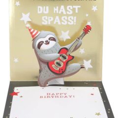 Beim Öffnen entfaltet sich die volle Magie. Sofort erklingt der ikonische Status Quo „Whatever you want“ – laut, klar, mitreißend. Gleichzeitig beginnen bunte Lichter zu blinken und schaffen ein echtes Konzert-Feeling im Miniaturformat. Das Faultier an der roten Gitarre füllt die Karte mit Rhythmus und Emotion.