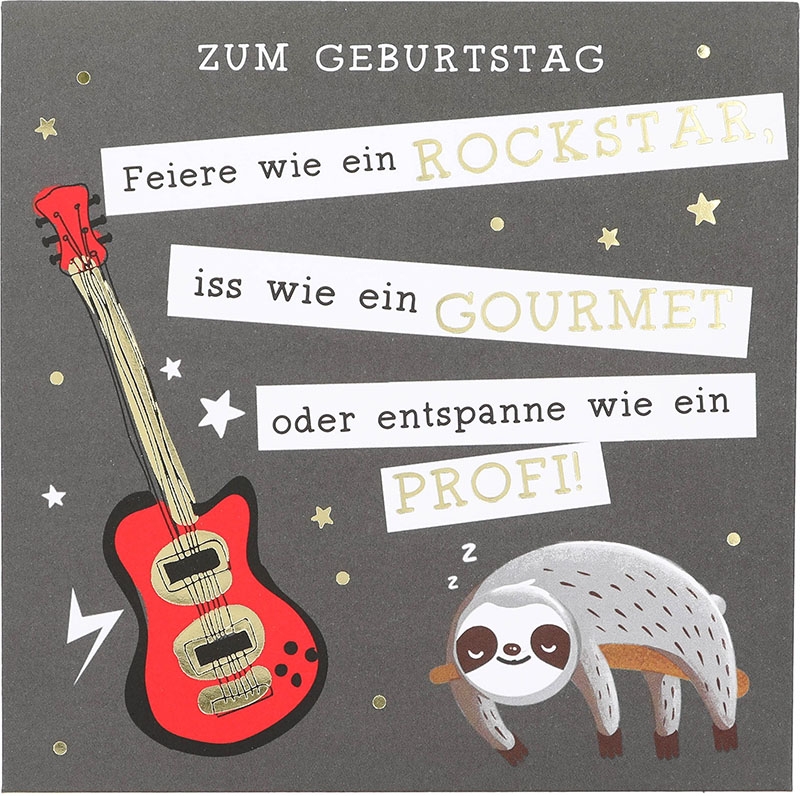 Beim Öffnen entfaltet sich die volle Magie. Sofort erklingt der ikonische Status Quo „Whatever you want“ – laut, klar, mitreißend. Gleichzeitig beginnen bunte Lichter zu blinken und schaffen ein echtes Konzert-Feeling im Miniaturformat. Das Faultier an der roten Gitarre füllt die Karte mit Rhythmus und Emotion.
