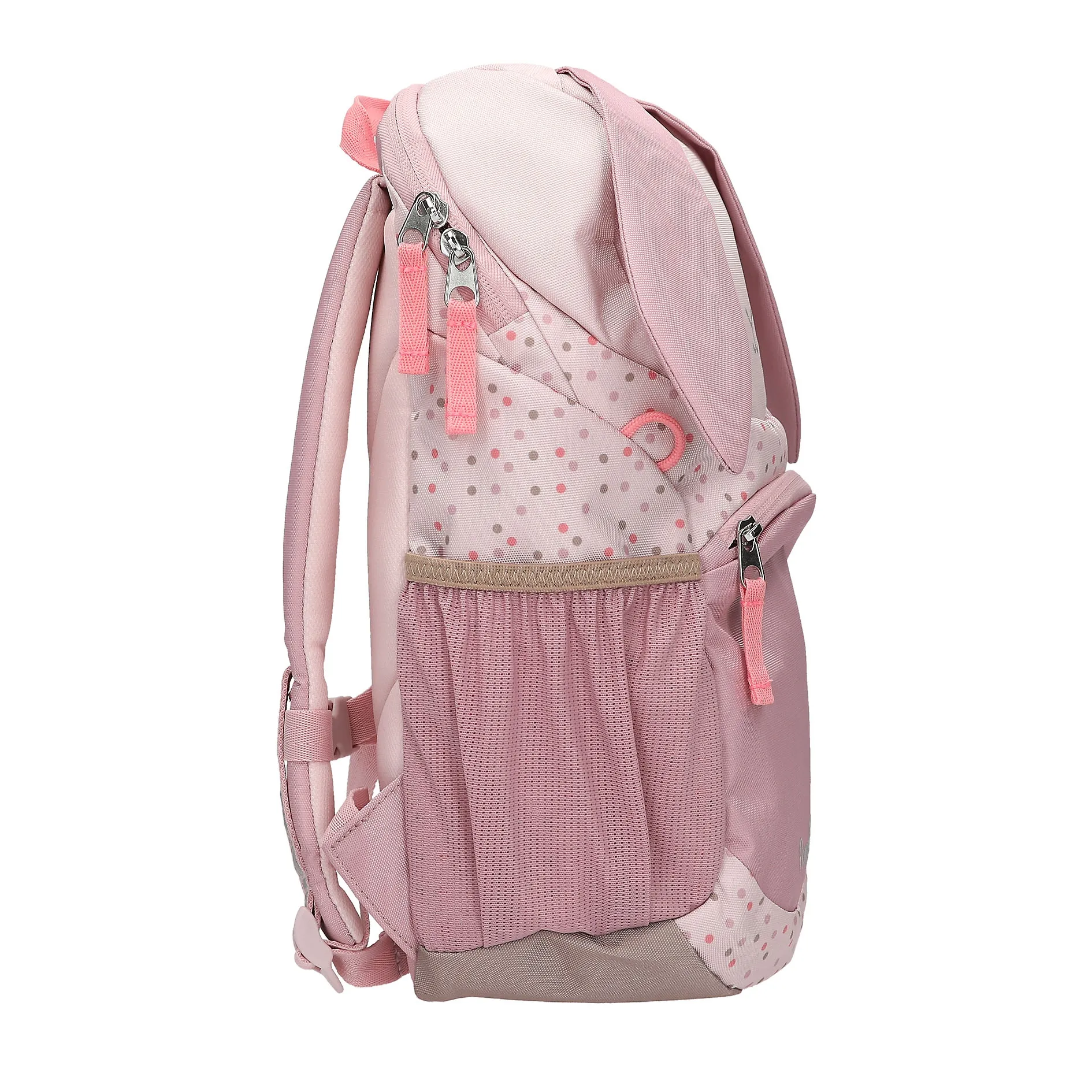 Das Herzstück dieses Rucksacks ist ohne Zweifel seine liebevolle Gestaltung. In zartem Rosa gehalten, verwandelt sich die Tasche durch zwei große, applizierte Schlappohren und ein aufgedrucktes, freundliches Hasengesicht mit rosigen Bäckchen in ein kleines Stofftier für den Rücken. Ein dezentes Pünktchen-Muster auf den Seiten und im unteren Bereich rundet den verspielten Look harmonisch ab. Dank dieses charmanten Designs wird der Rucksack schnell zum unverzichtbaren Freund, den kleine Mädchen stolz überallhin mitnehmen möchten.