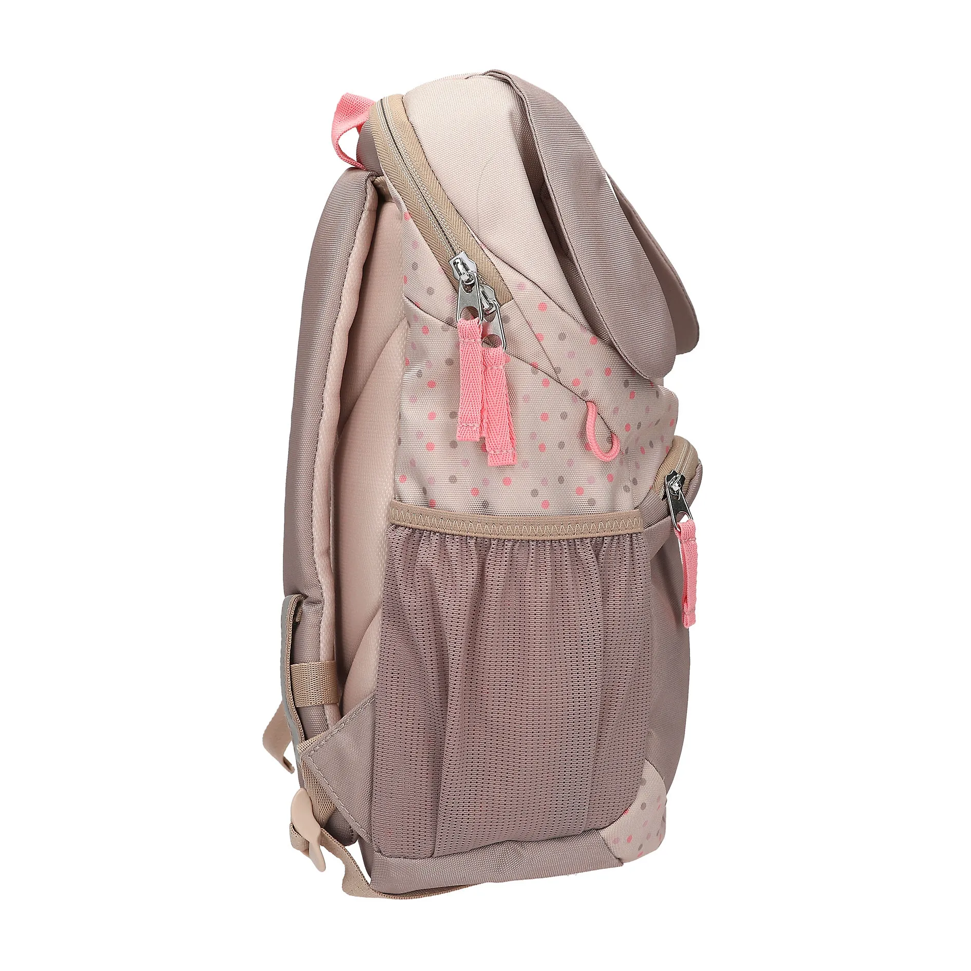 Das Highlight dieses Rucksacks ist unübersehbar das drollige Hundegesicht auf der Vorderseite. Mit großen, treuen Augen, rosigen Bäckchen und einem freundlichen Lächeln erobert es die Herzen im Sturm. Ein besonderer Hingucker sind die applizierten, weichen Schlappohren, die über den Rucksackrand hinausragen und ihm einen lebendigen 3D-Effekt verleihen. Abgerundet wird der charmante Look durch ein dezentes, farblich abgestimmtes Pünktchen-Muster, das dem Rucksack eine besonders verspielte Note verleiht.