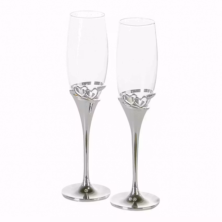Beide Kelche haben ineinander verschlungene Herzen als Motiv aus Metall und den dazugehörigen Fuß aus Metall