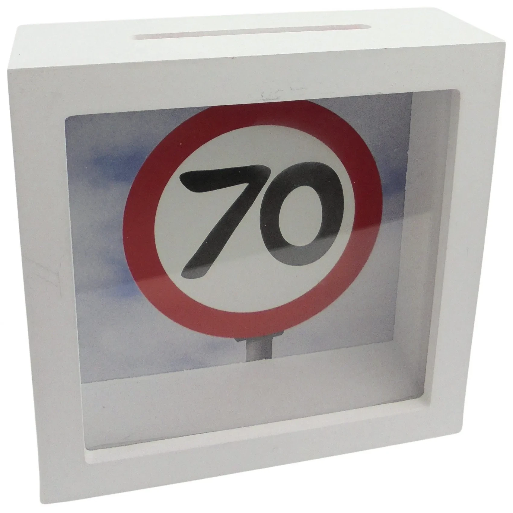 Schon das Design zieht die Blicke auf sich. Das Motiv eines Verkehrsschilds mit der Zahl „70“ ist klar, modern und zugleich humorvoll. Es symbolisiert Lebenswege, Erfahrungen und viele gemeinsame Erinnerungen. Gleichzeitig sorgt der schlichte, weiße Holzrahmen für eine elegante und zeitlose Optik, sodass sich die Spardose harmonisch in jede Umgebung einfügt.