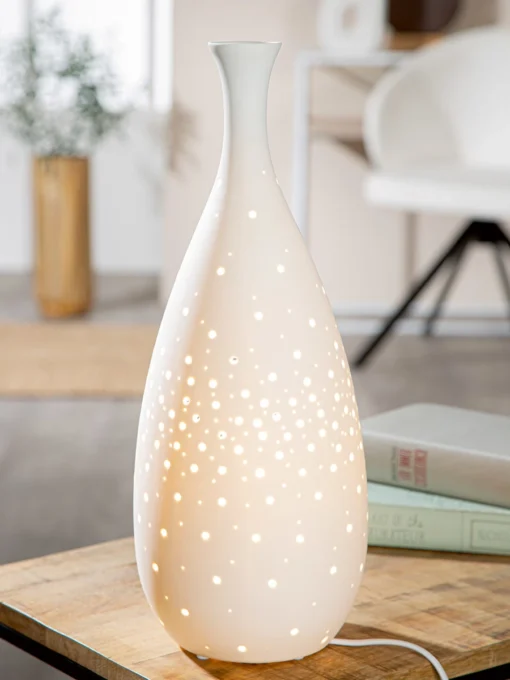 Mit der Tischleuchte „Galaxy“ schmal holen Sie sich ein Stück nächtlichen Zauber und zeitlose Eleganz in Ihr Zuhause. Diese außergewöhnliche Porzellanleuchte begeistert durch ihre schlanke, vasenähnliche Form, und zugleich fasziniert sie mit einem trendigen Prickellook sowie einem feinen Punkte-Muster, das an einen funkelnden Sternenhimmel erinnert. So entsteht ein sanftes, warmes Licht, das Ihre Räume stilvoll erhellt, während es zugleich eine behagliche Atmosphäre schafft.