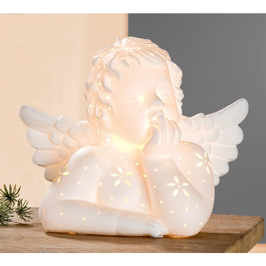 Die Tischleuchte „Raffael“ schenkt Ihrem Zuhause eine ganz besondere Atmosphäre, denn sie verbindet sanftes Licht mit einer symbolstarken Form. Als Engel gestaltet, wirkt diese Leuchte schützend, ruhig und zugleich inspirierend, und genau deshalb berührt sie auf emotionale Weise. Die feinen Ausstanzungen aus Blumen und Punkten verleihen dem Engel eine außergewöhnliche Leichtigkeit, während das hochwertige Porzellan für Eleganz und Beständigkeit sorgt.