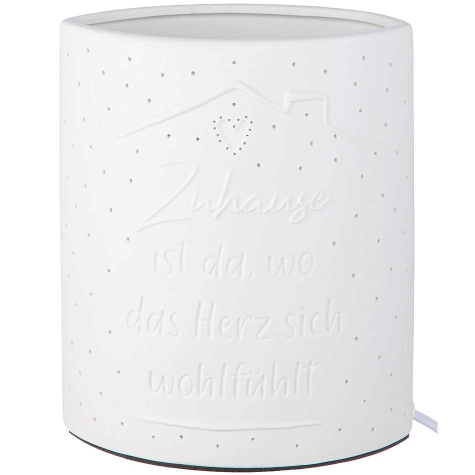 Mit der Tischleuchte ” Zuhause ” holen Sie sich ein Stück Geborgenheit in Ihre vier Wände, denn sie verbindet stilvolles Design mit einer emotionalen Botschaft. Das angedeutete Hausmotiv mit dem liebevollen Spruch „Zuhause ist da, wo das Herz sich wohlfühlt“ sowie das kleine Herzchen im Giebel berühren auf den ersten Blick. Gleichzeitig sorgt der trendige Prickellook mit feinem Punkte-Muster für eine moderne und zugleich zeitlose Optik. So entsteht ein Wohnaccessoire, das Wärme ausstrahlt und Ihr Zuhause spürbar bereichert.