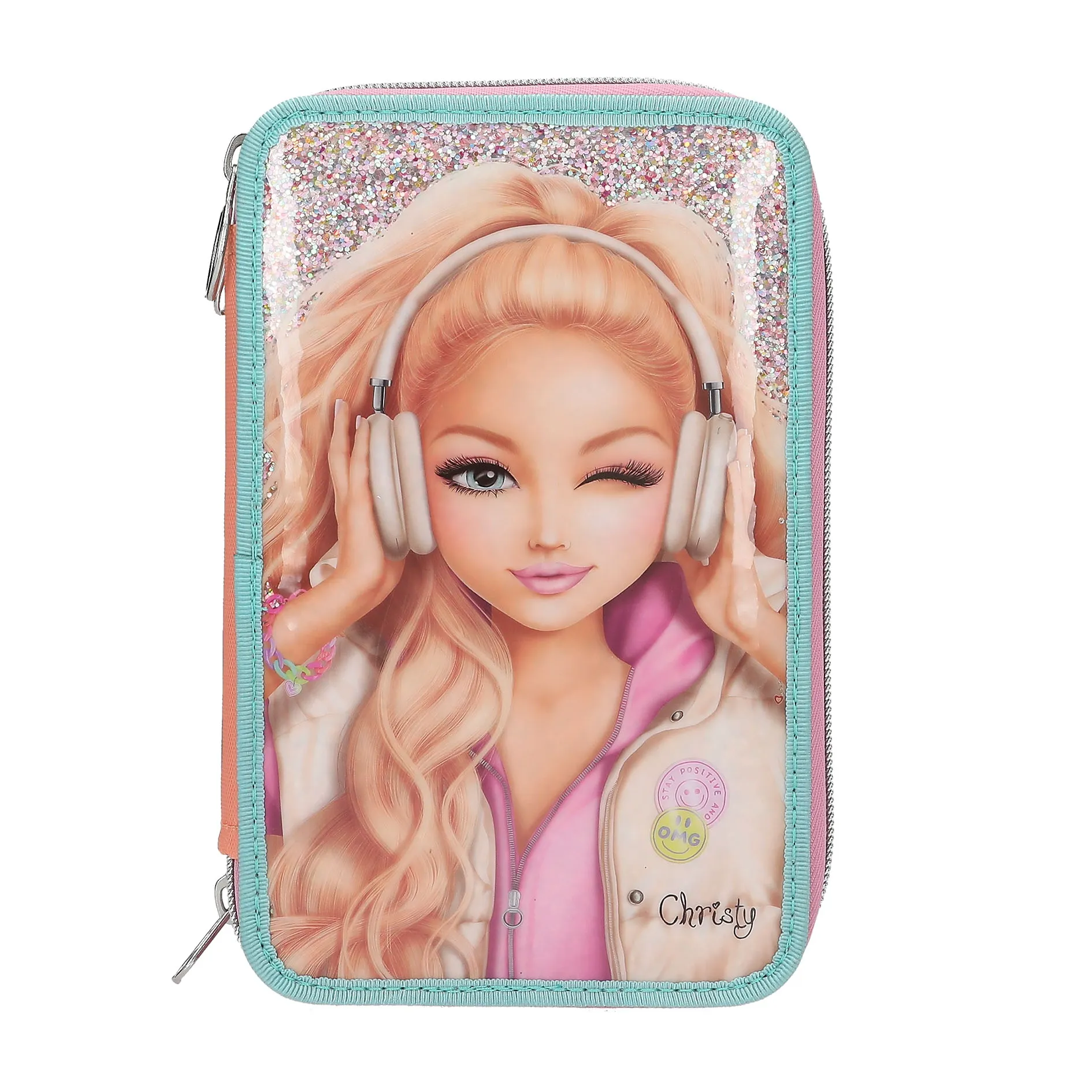 Schon auf den ersten Blick begeistert die Federtasche durch ihre aufwendig gestaltete Front. Das große Motiv zeigt TOPModel Christy mit stylischen Kopfhörern und einem coolen Augenzwinkern. Das Besondere: Der Hintergrund des Motivs ist mit buntem Glitzer hinterlegt, der bei jeder Bewegung magisch funkelt. Eingefasst in einen türkisfarbenen Rahmen, wird das Cover aus robustem PVC zum absoluten Blickfang in jeder Schultasche.