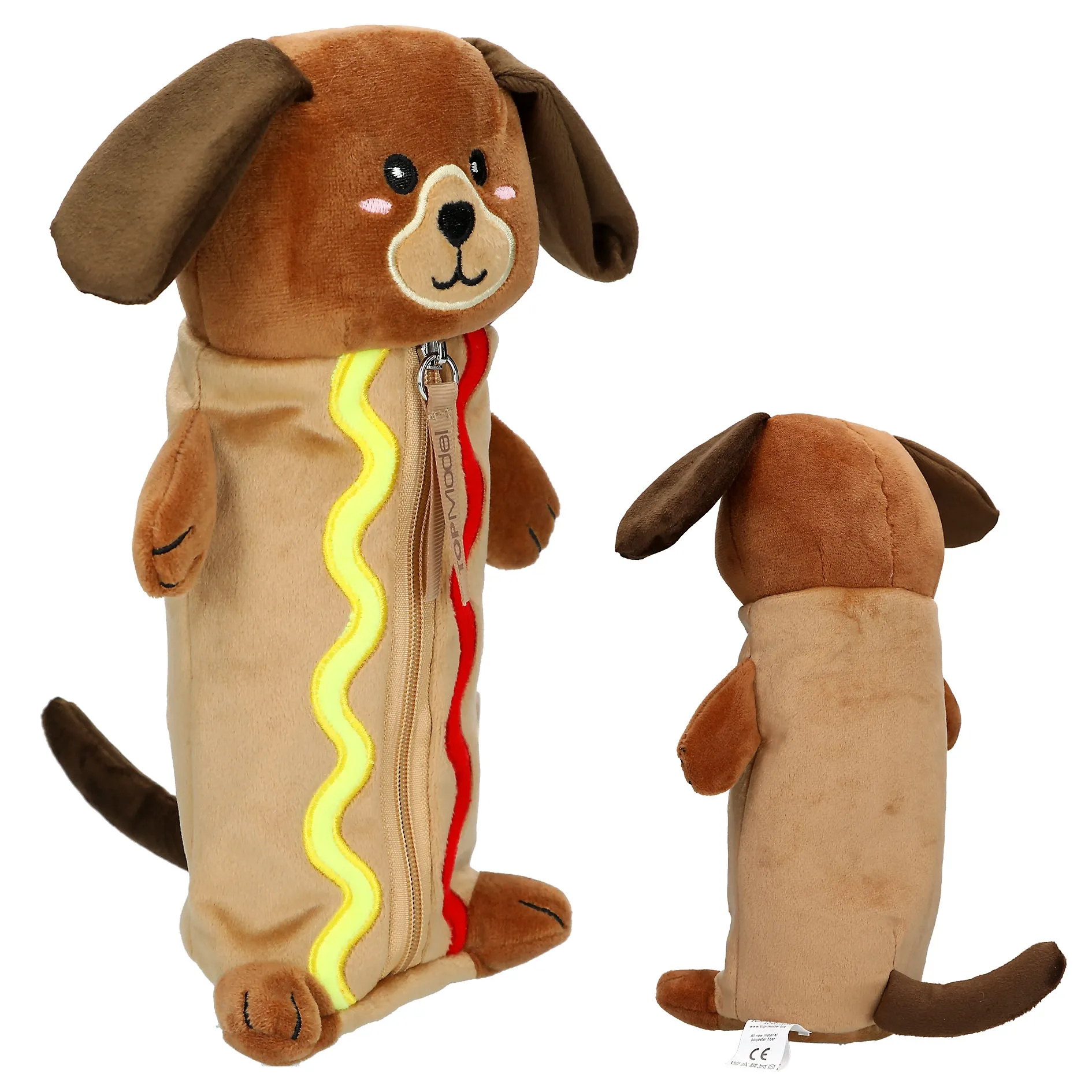 Das Federmäppchen besteht aus hochwertigem Polyester, was es besonders soft und gleichzeitig widerstandsfähig macht. Das plüschige Material lädt fast schon zum Kuscheln ein, während die solide Verarbeitung dafür sorgt, dass der “Hotdog-Hund” viele Schultage lang ein treuer Begleiter bleibt.