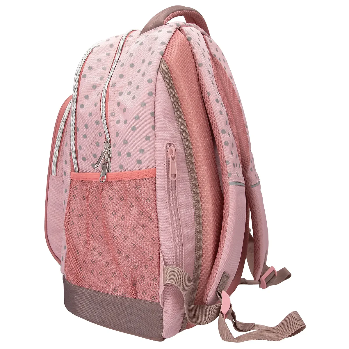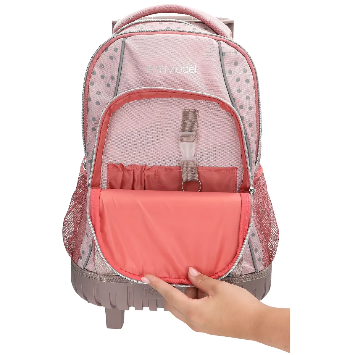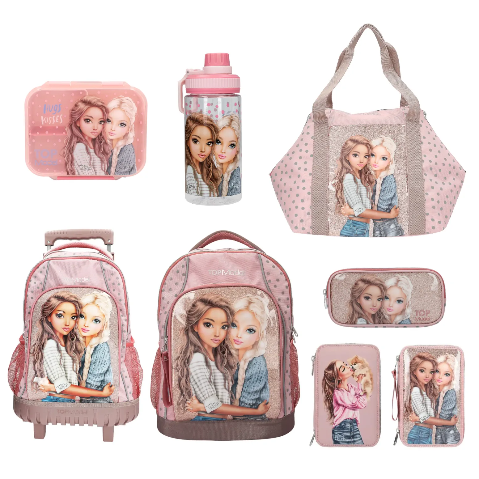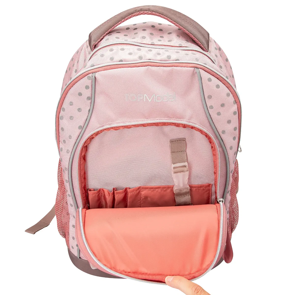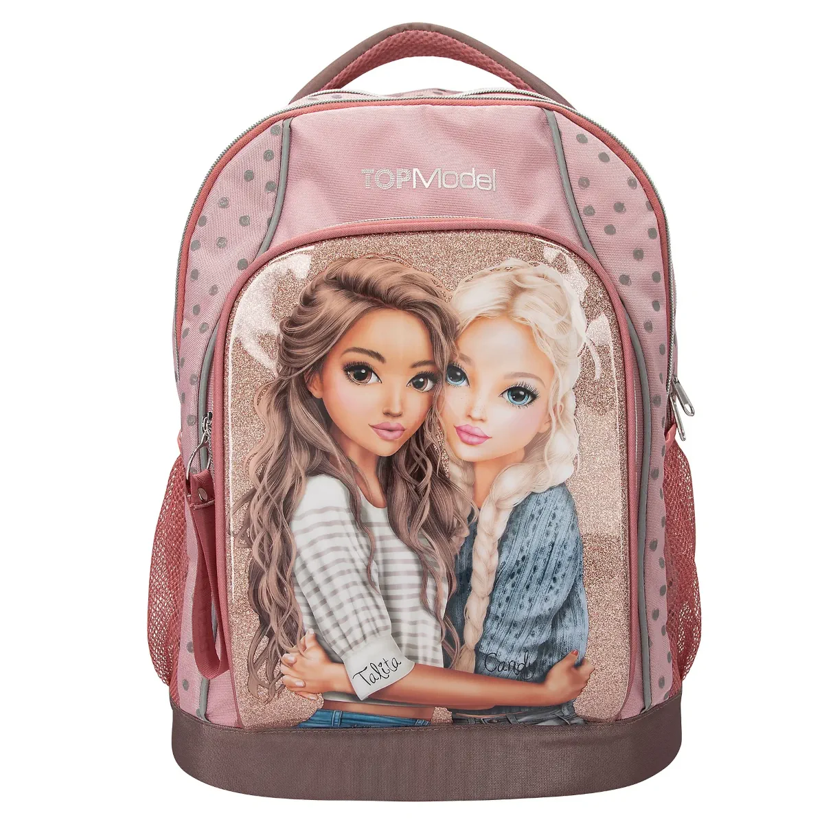 Der Rucksack besticht durch seine harmonische Farbkombination in zartem Rosa, kombiniert mit stylischen grauen Punkten (“Dots”). Das absolute Highlight ist das große Doppel-Modelmotiv mit Talita & Candy auf der Vorderseite, das vor einem edel funkelnden Glitzerhintergrund präsentiert wird. Ein dezenter, silberner TOPModel-Schriftzug rundet den modernen Look ab.