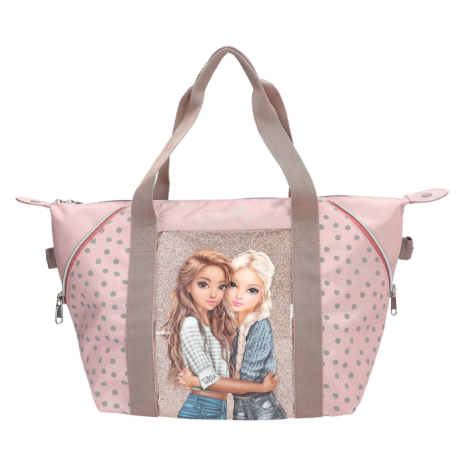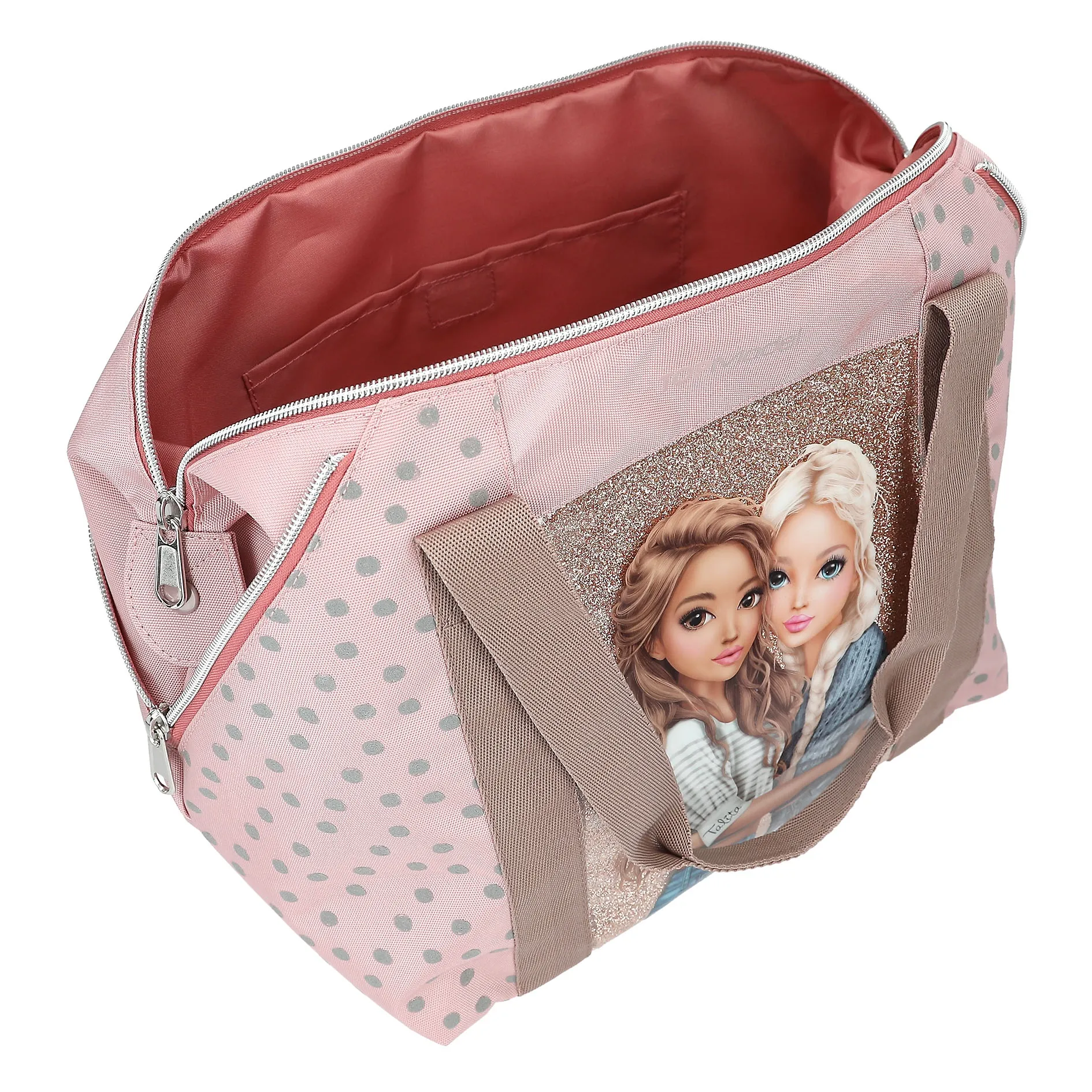 Das Herzstück der Tasche ist das großflächige Motiv auf der Vorderseite. Hinter einer schützenden PVC-Schicht funkeln die TOPModels Talita und Candy auf einem Untergrund aus prachtvollem, rosafarbenem Glitzer. Das restliche Design besticht durch einen modischen Mix. Während die Seitenwände mit verspielten grauen Punkten (Dots) bedruckt sind, verleihen die stabilen, beigefarbenen Tragegriffe der Tasche einen modernen, sportlichen Look.