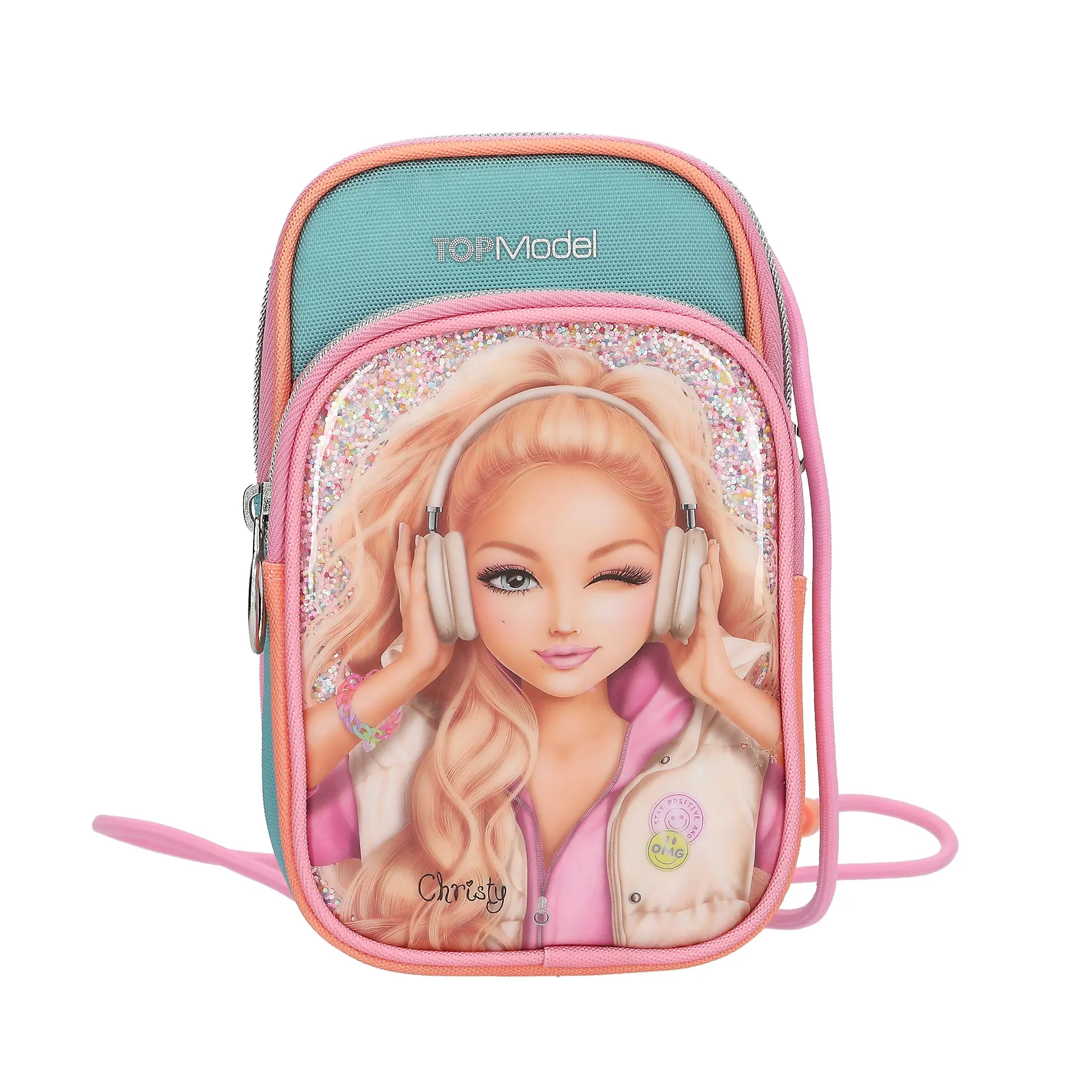Die Vorderseite der Tasche ist ein echtes Highlight. TOPModel Christy strahlt mit ihren stylischen Kopfhörern um die Wette. Der Clou ist die mit buntem Glitzer hinterlegte Fronttasche, die im Licht magisch funkelt und das moderne Motiv perfekt in Szene setzt. Mit der frischen Farbkombination aus Pink, Türkis und Apricot setzt du bei jedem Outfit ein modisches Statement.
