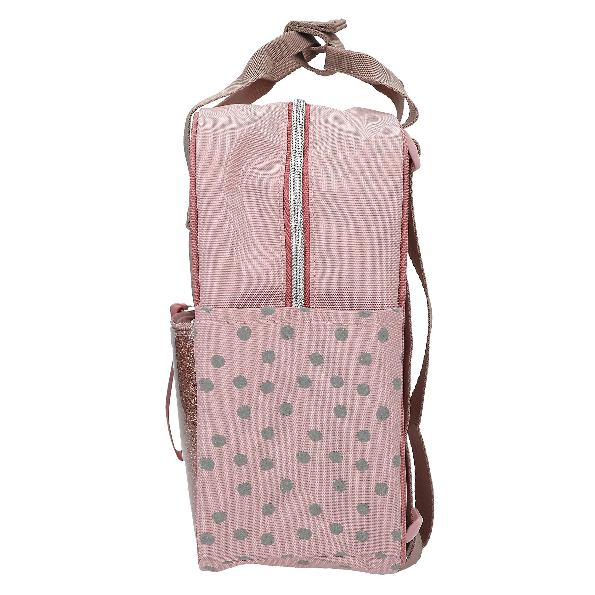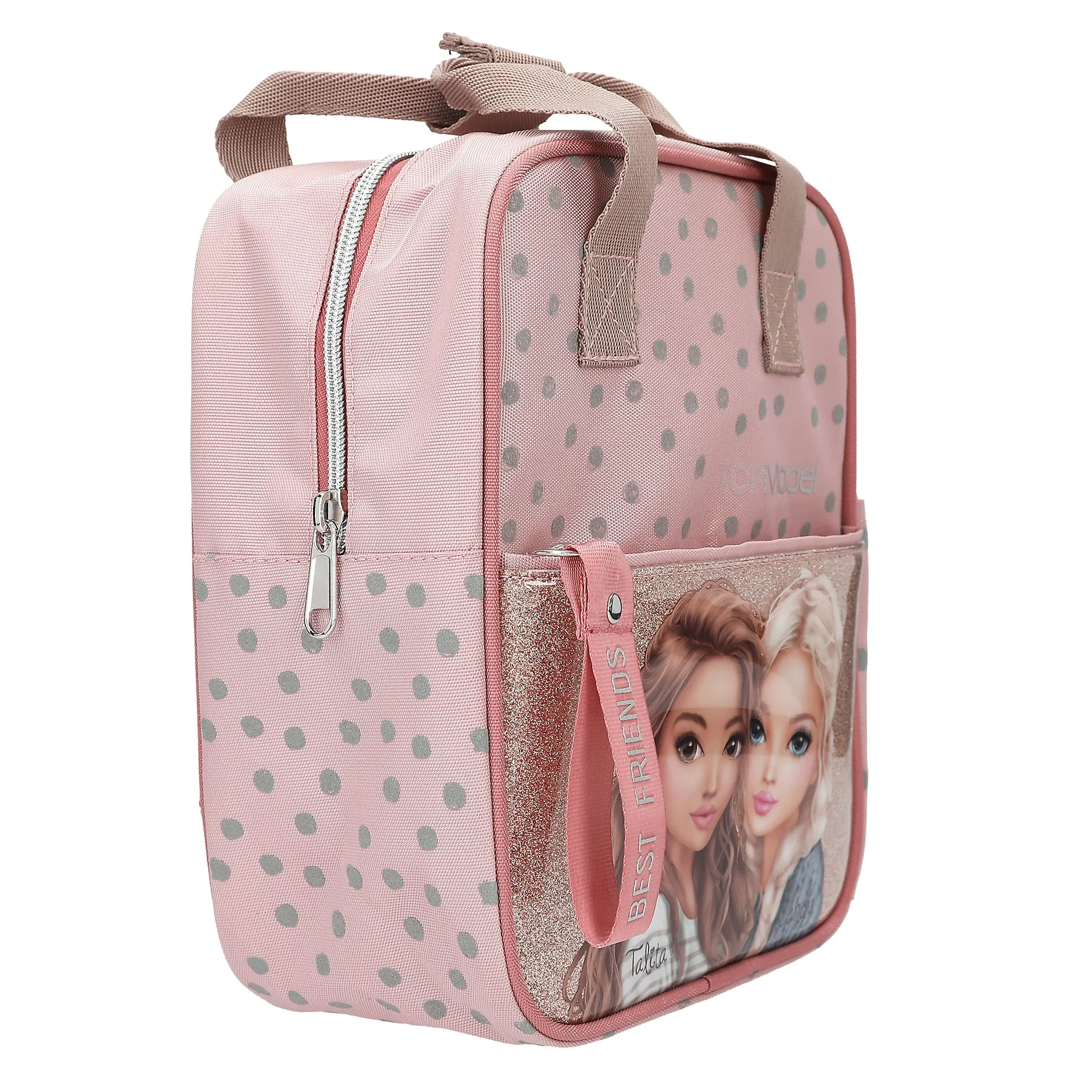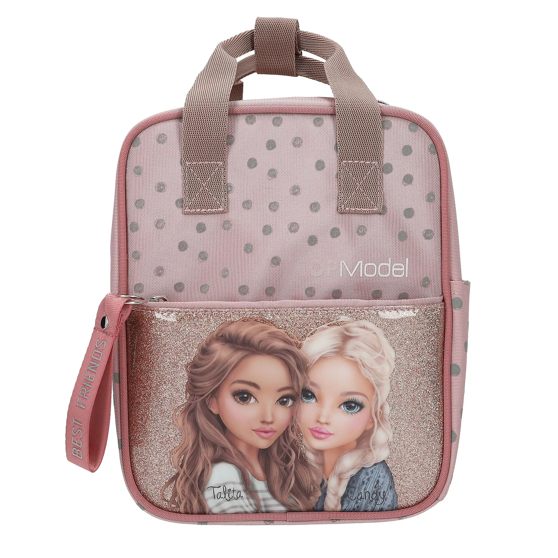 Der Rucksack besticht durch seine sanfte rosafarbene Grundfarbe, die durch ein schickes Muster aus grauen Punkten (Dots) aufgelockert wird. Das absolute Herzstück ist die Fronttasche. Hier präsentieren sich die beliebten Charaktere Talita und Candy auf einem funkelnden Glitzerhintergrund. Ein besonderes Detail ist der Reißverschluss-Anhänger mit dem Schriftzug „BEST FRIENDS“, der dem Look eine liebevolle Note verleiht.