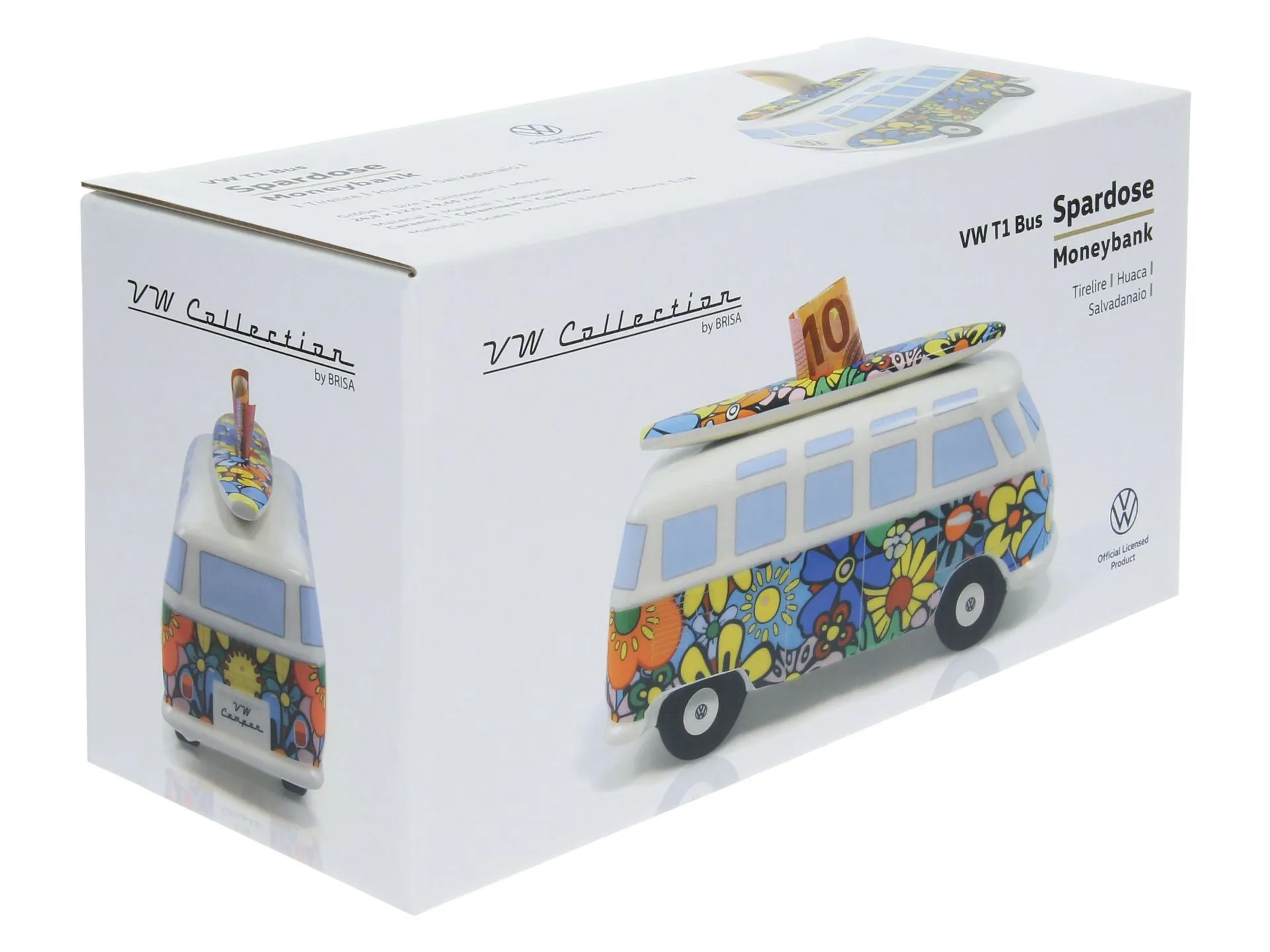 Jeder VW Bus ist ein kleines Unikat, weil die detailgetreue Bemalung mit großer Sorgfalt erfolgt. Auf dem Dach befindet sich ein Surfbrett in Wagenfarbe, das nicht nur optisch überzeugt, sondern auch als Münzschlitz dient. Dadurch verbinden sich Design und Funktion sinnvoll. Auf der Unterseite sorgt ein Gummipfropfen für bequemes Entnehmen des Geldes, sodass Sie jederzeit Zugriff haben. Da kein Hammer notwendig ist, bleibt die Spardose dauerhaft nutzbar und begleitet Sie über viele Jahre.