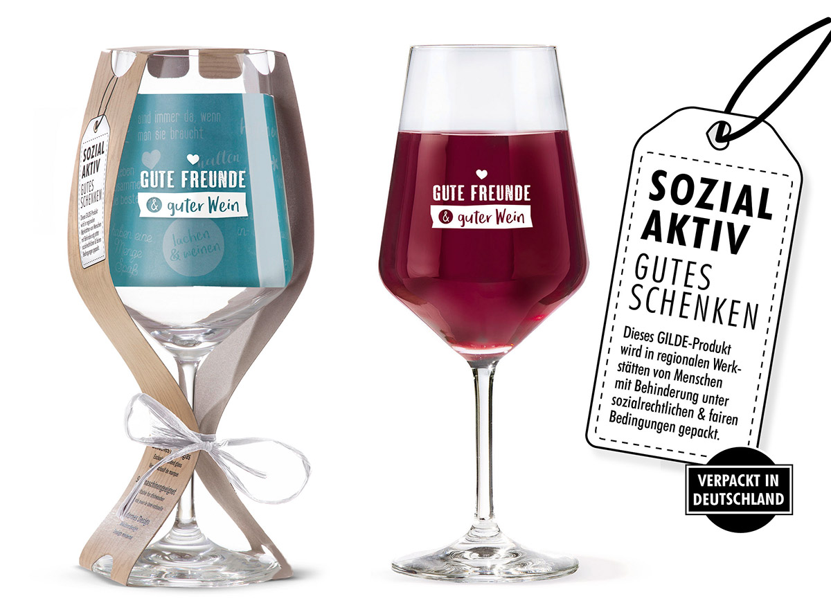 Weinglas mit Spruch „Gute Freunde & guter Wein“ – Genuss, der Freude macht