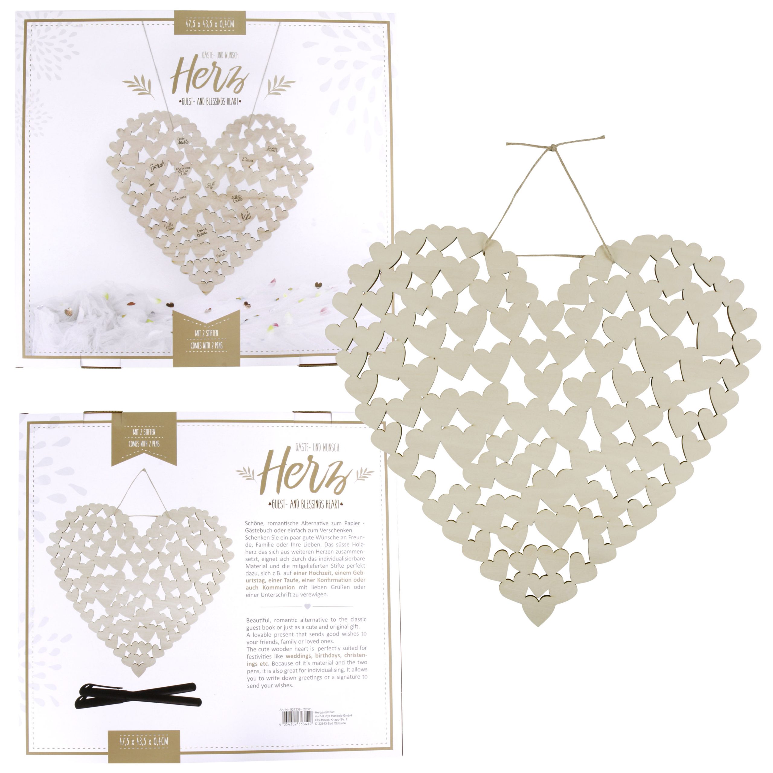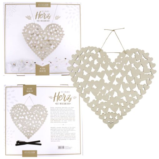 Jeder Gast kann ein Holzherz mit Glückwünschen, Widmungen und Unterschrift verzieren. So entsteht ein wunderschönes und individuelles Geschenk, ein zauberhaftes Erinnerungsstück an einen schönen Tag im Leben, an den man sich noch viele Jahre erfreuen kann.